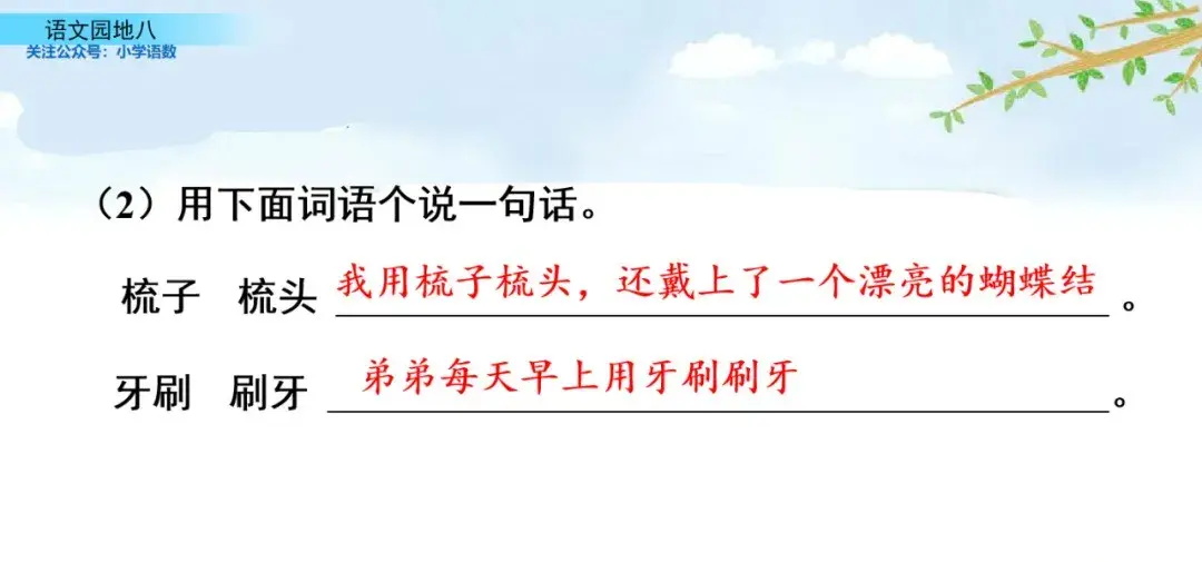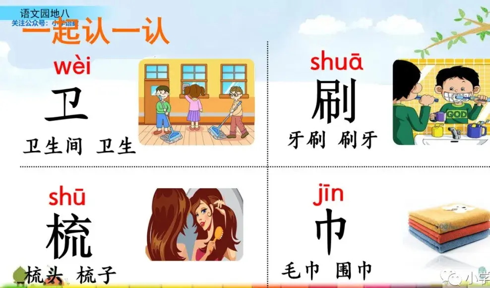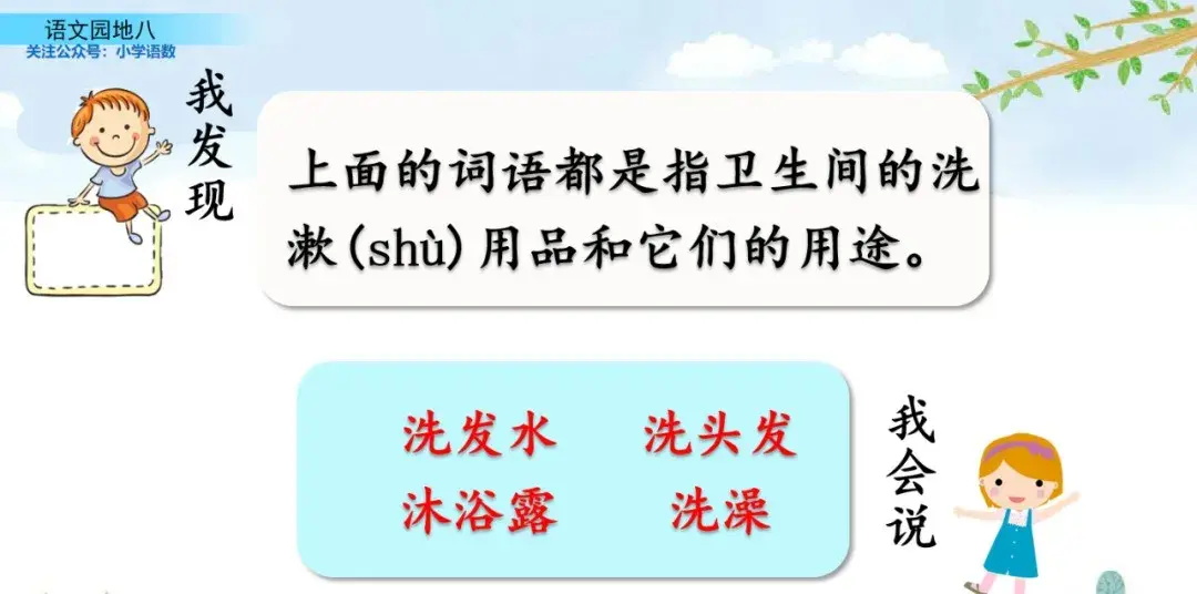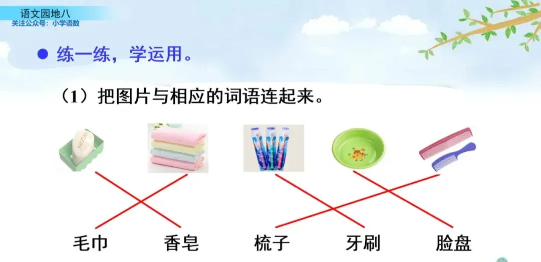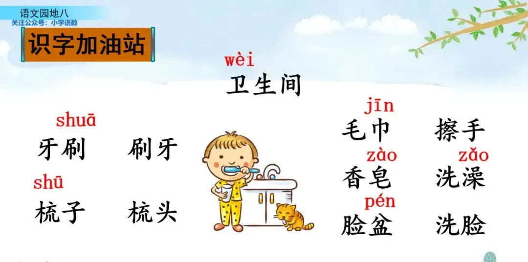 我发现本次识字加油站这些词语的特点:左边“牙刷、梳子、毛巾、香皂、脸盆”表示日常生活用品,右边“刷牙、梳头、擦手、洗澡、洗脸”表示用途。