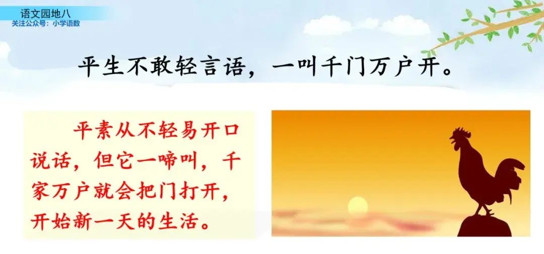 头上的红色冠子不用特别剪裁,雄鸡身披雪白的羽毛雄纠纠地走来。它平生不敢轻易鸣叫,它叫的时候,千家万户的门都打开。