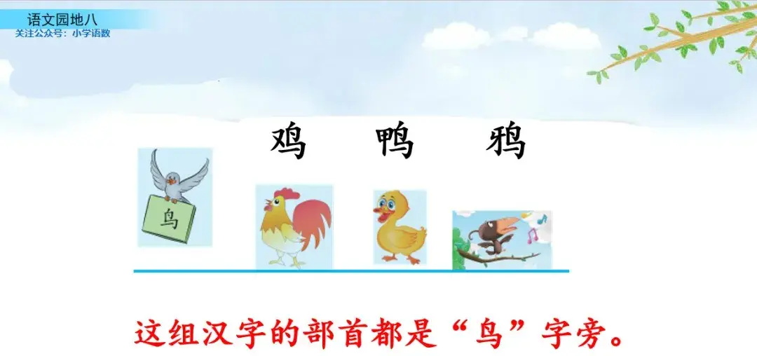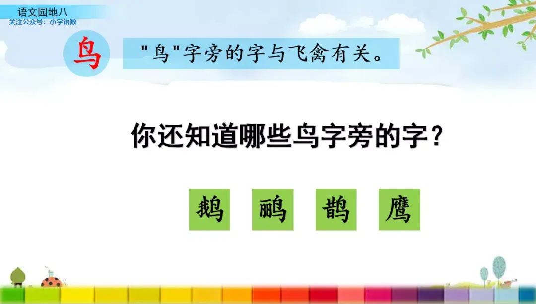 鸟字旁的字大多与鸟类和禽类有关,如:鸡、鸭、鹅;