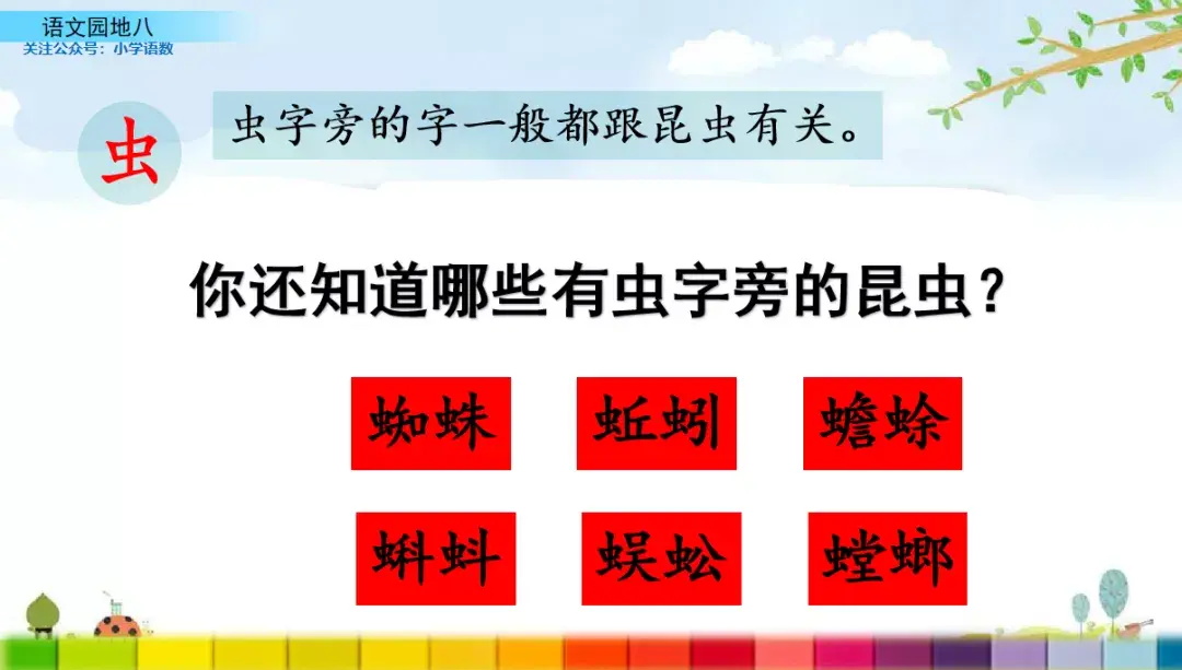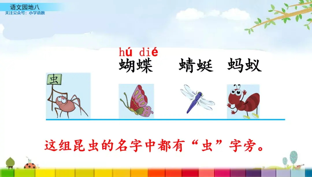 虫字旁的字大多与昆虫有关,如:蝴、 蝶 、蜻、 蜓、 蚂、蚁。