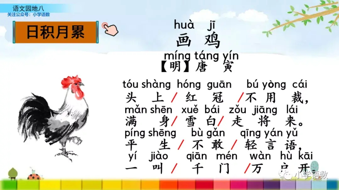 这首古诗的作者是(明)代的唐寅,诗句中的描写的一只( 白 )色的大公鸡。诗中表示数量的词语有( 一)、(千)、(万)。