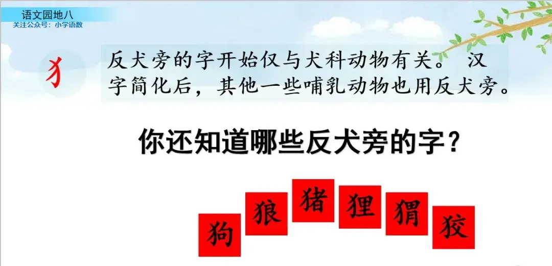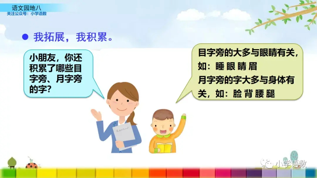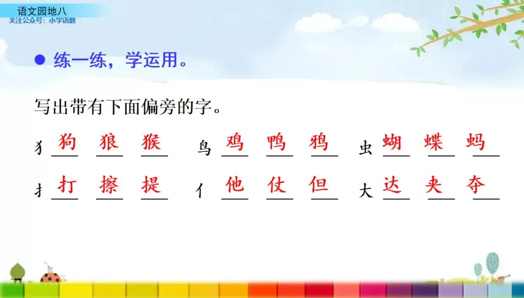 4.语文园地中“识字加油站”的内容经常以归类的形式出现。“我的发现”经常以填空或写出带有下列偏旁的字的形式出现,“日积月累”经常以填空的形式出现。