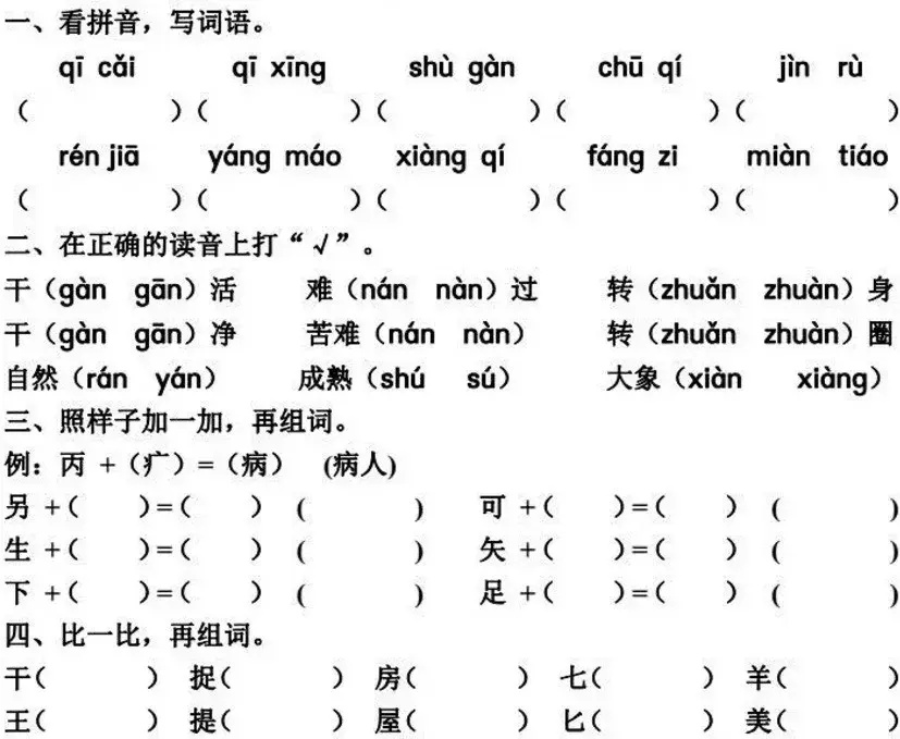 干(才干) 捉(捉拿) 房(房子) 七(七星) 羊(山羊)