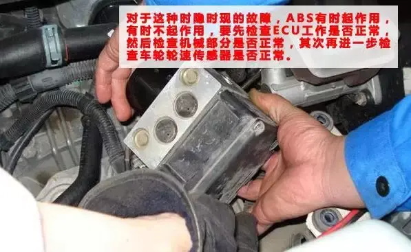 对于这种时隐时现的故障,ABS有时起作用,有时不起作用,要先检查ECU工作是否正常,然后检查机械部分是否正常,其次再进一步检查车轮轮速传感器是否正常。